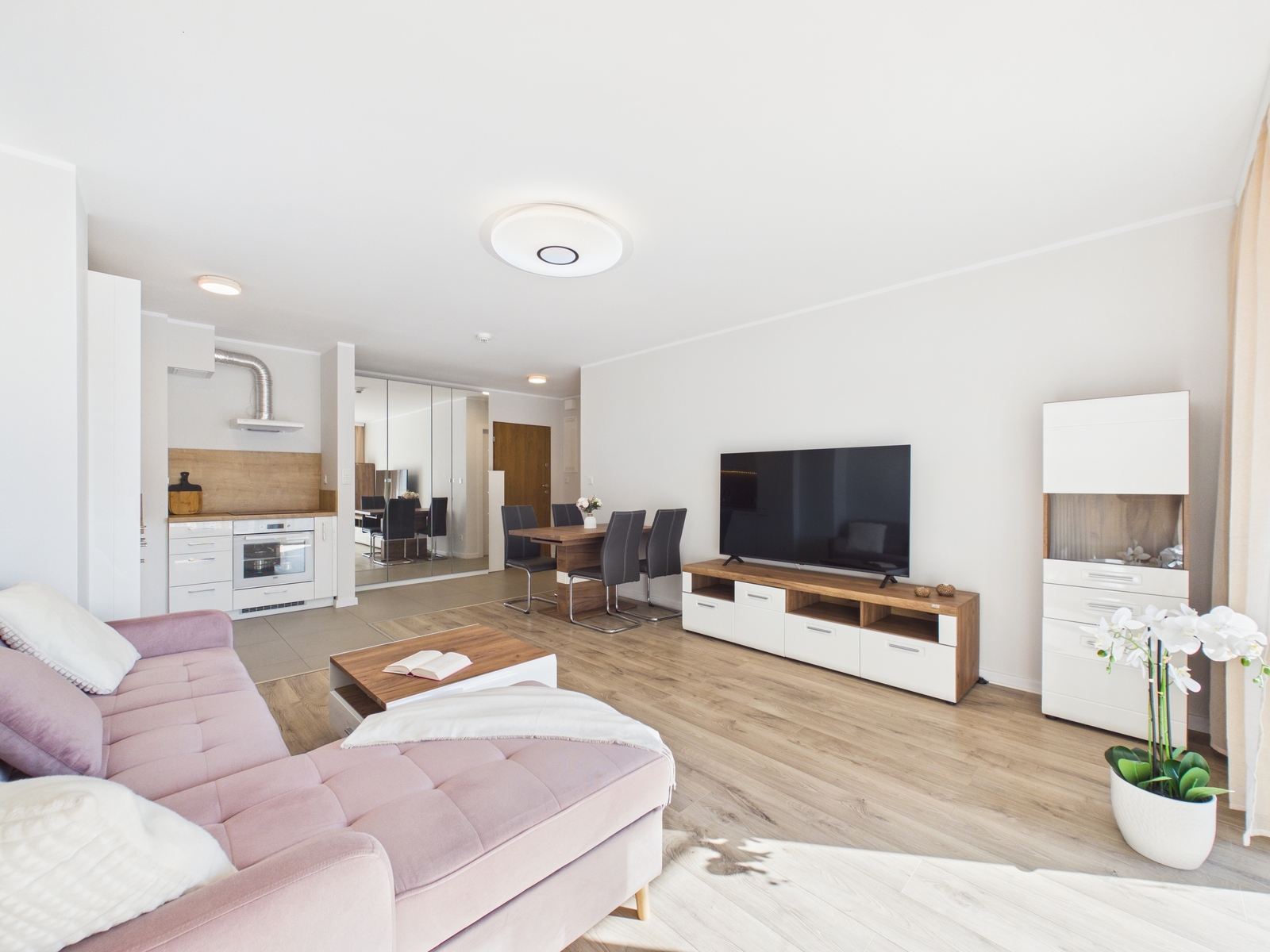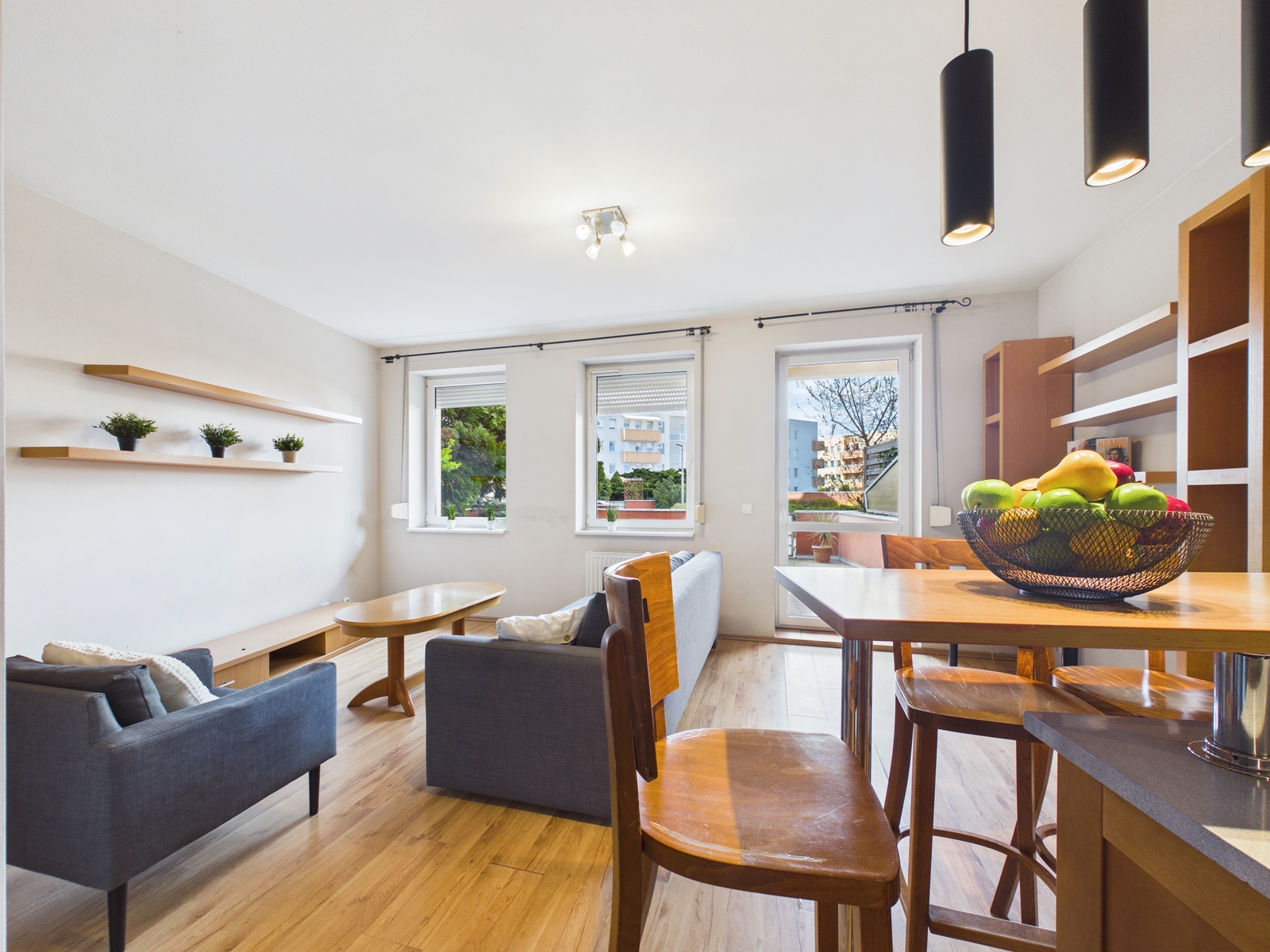• przestronny salon z aneksem kuchennym,