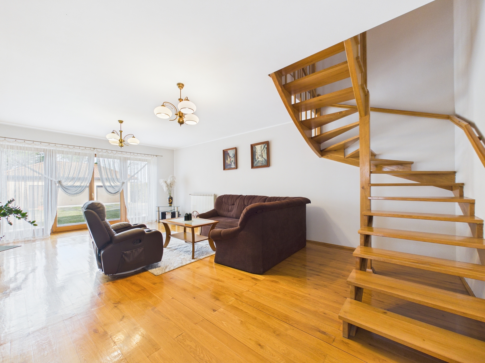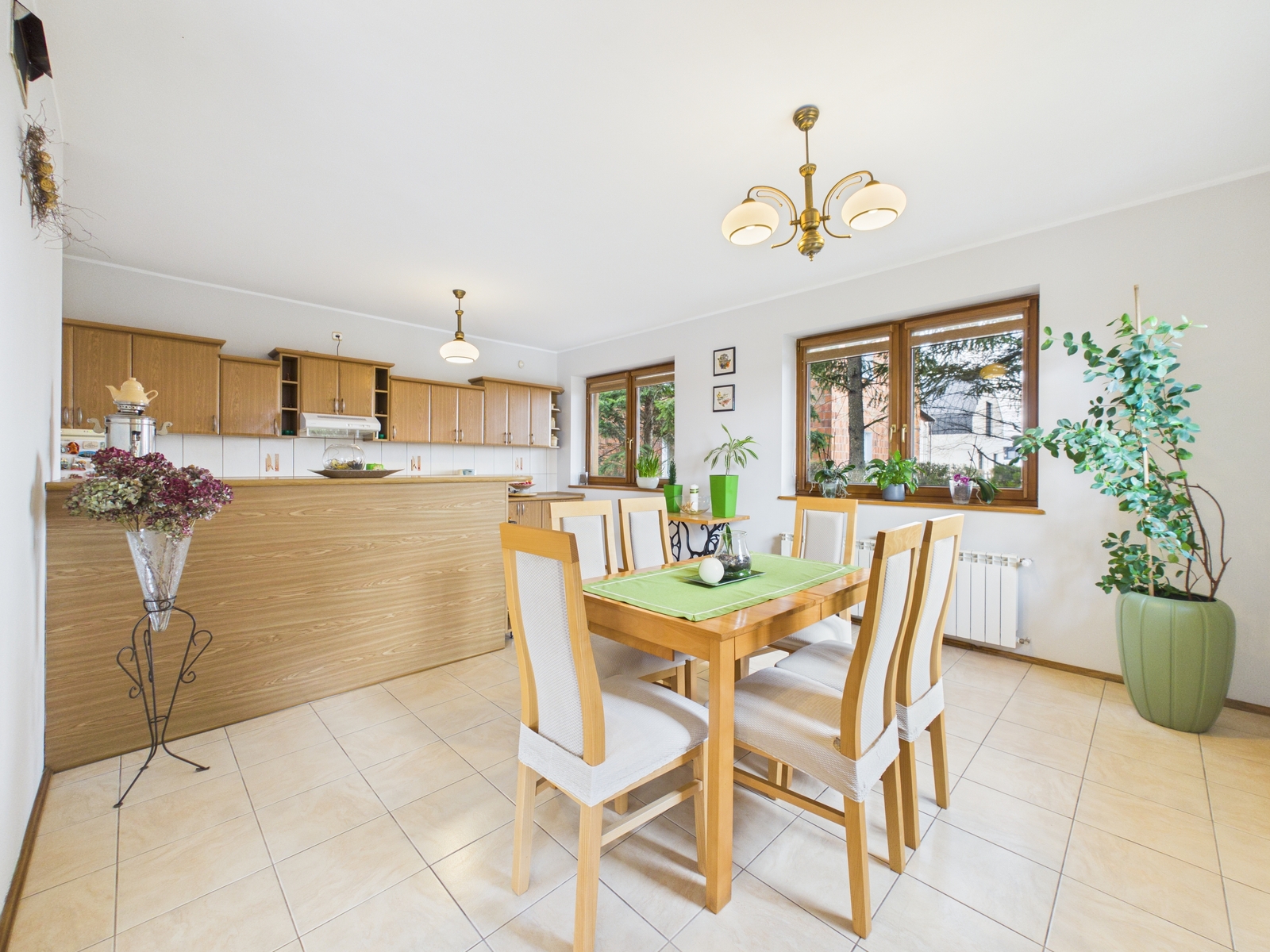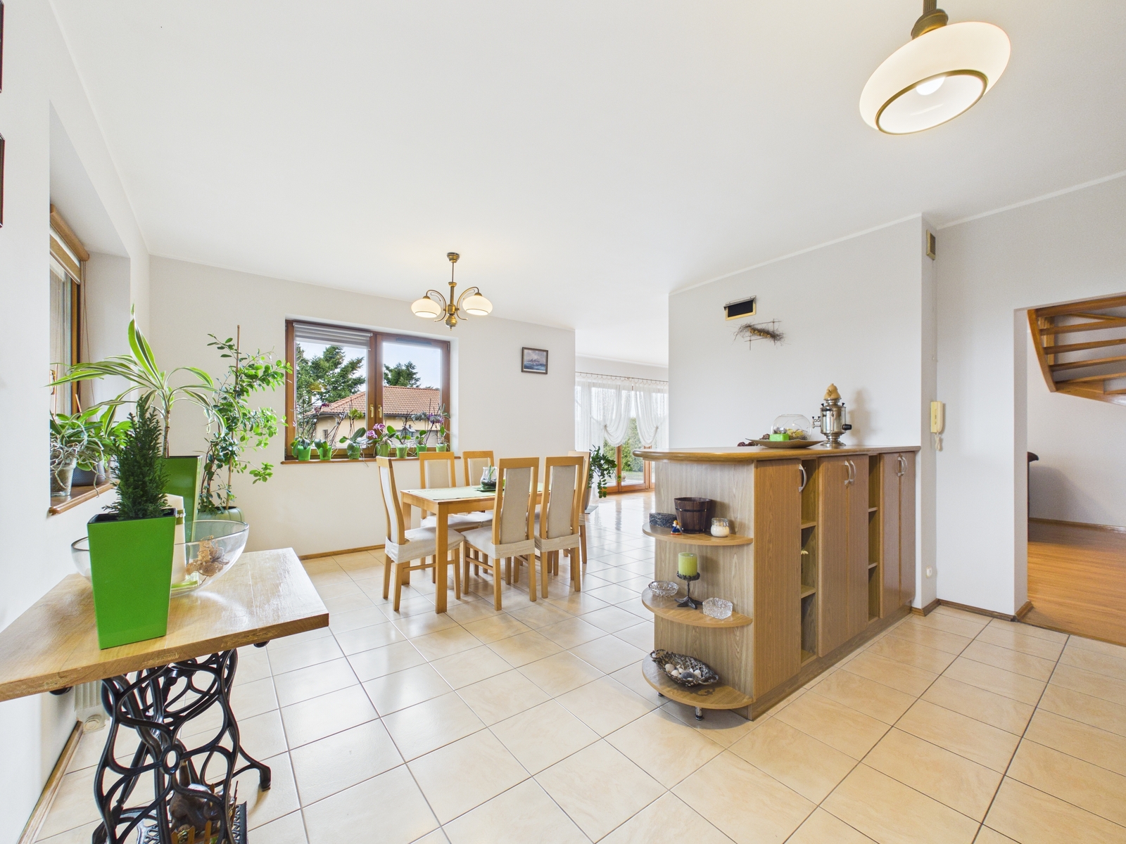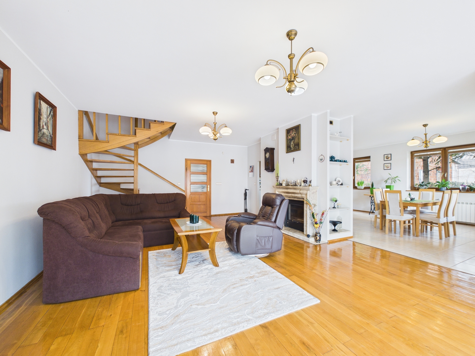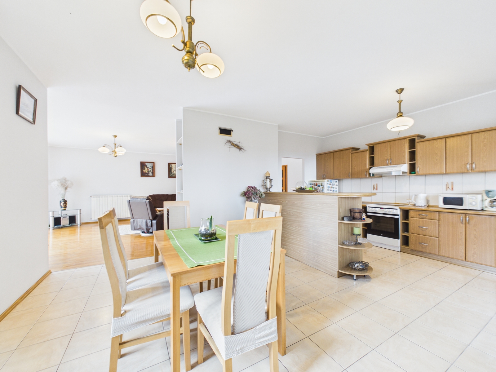 Główna część domu to bardzo duży, jasny salon z wyjściem na ogród, połączony z kuchnią i jadalnią, co tworzy nowoczesną i wygodną przestrzeń do życia i spotkań rodzinnych.