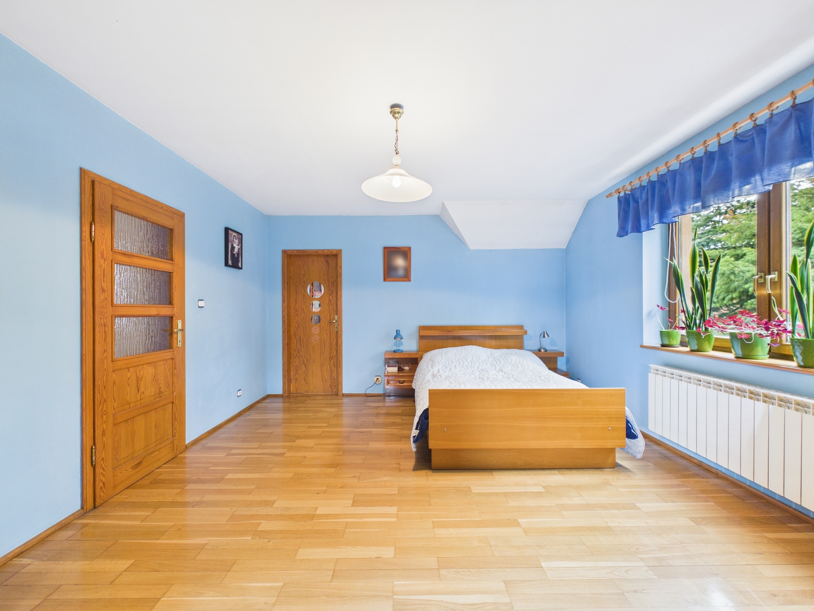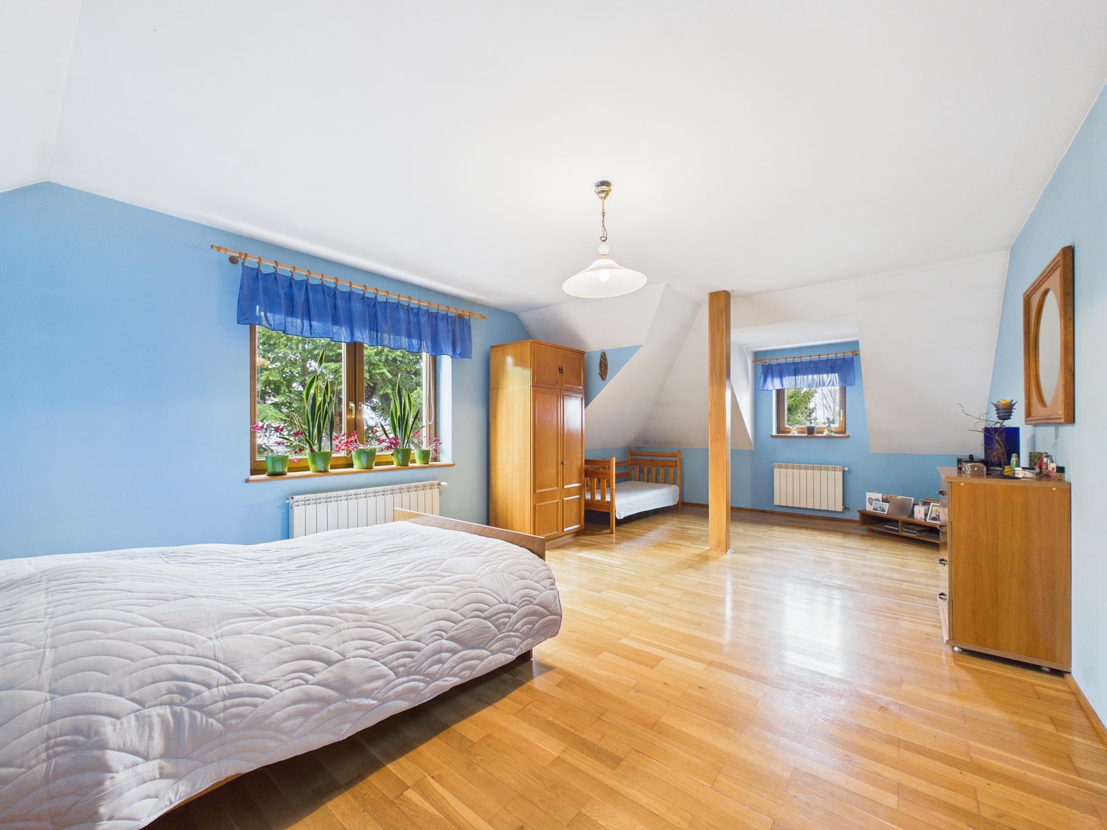 Na piętrze znajdują się sypialnie, z których każda posiada własną garderobę, co zapewnia wyjątkowy komfort użytkowania.