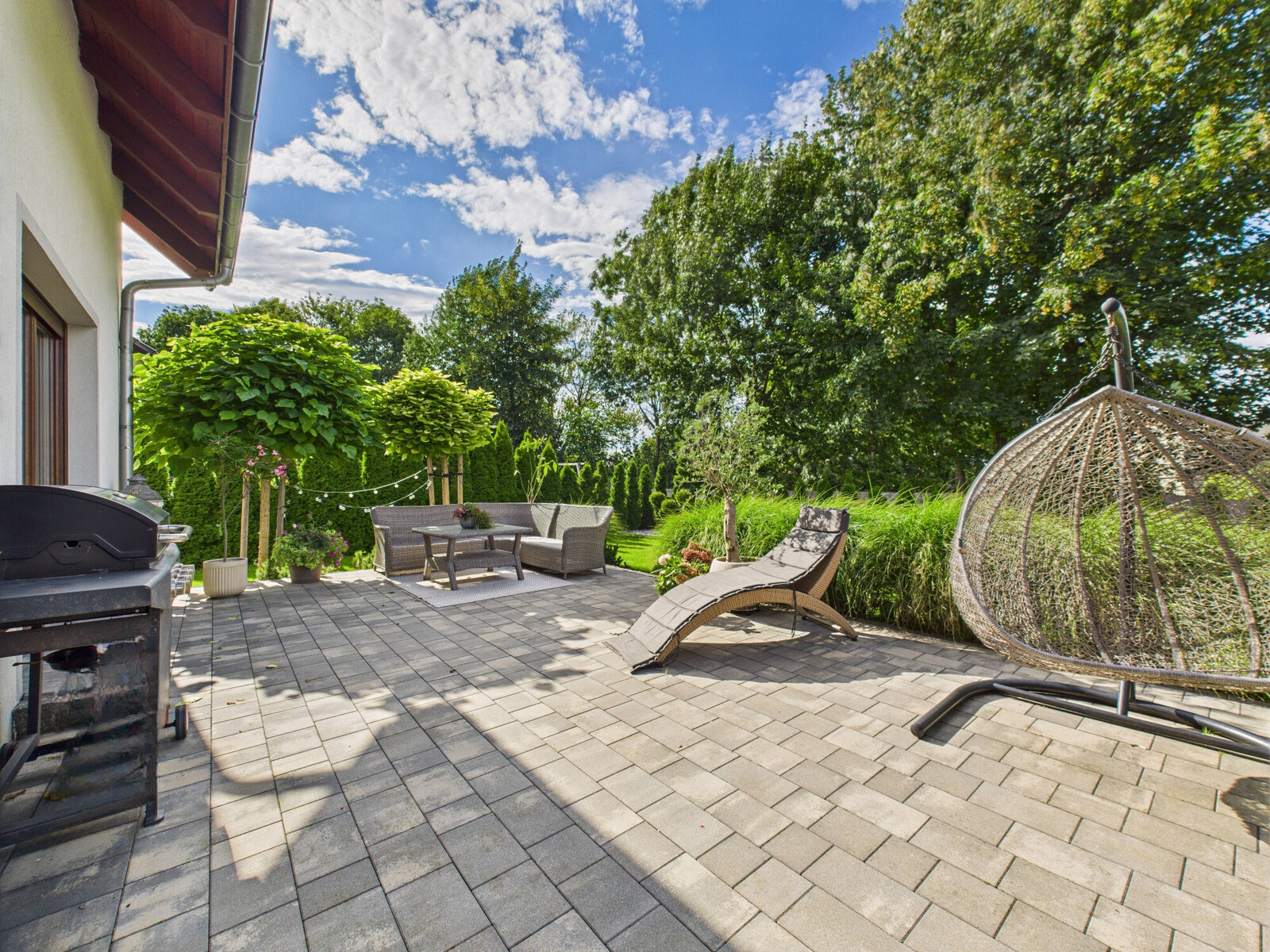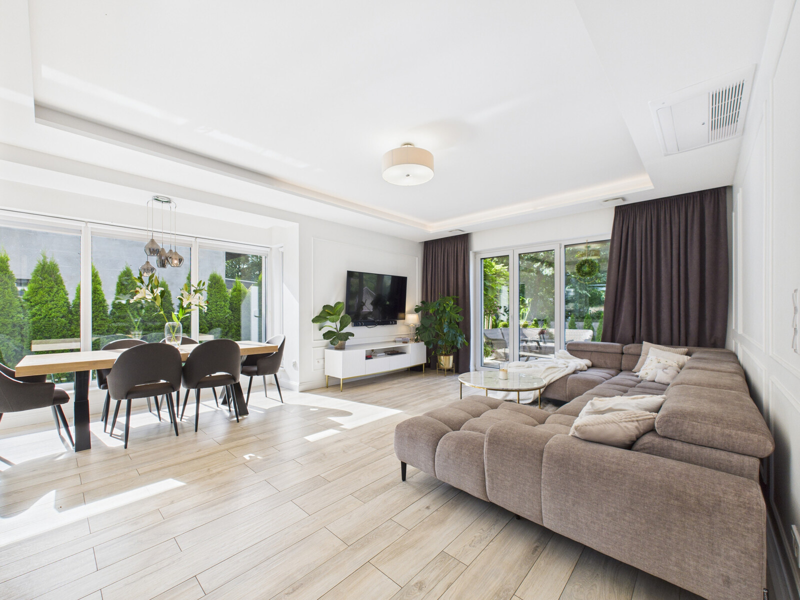 Wyjątkowy salon z wyjściem na taras i widokiem na ogród.