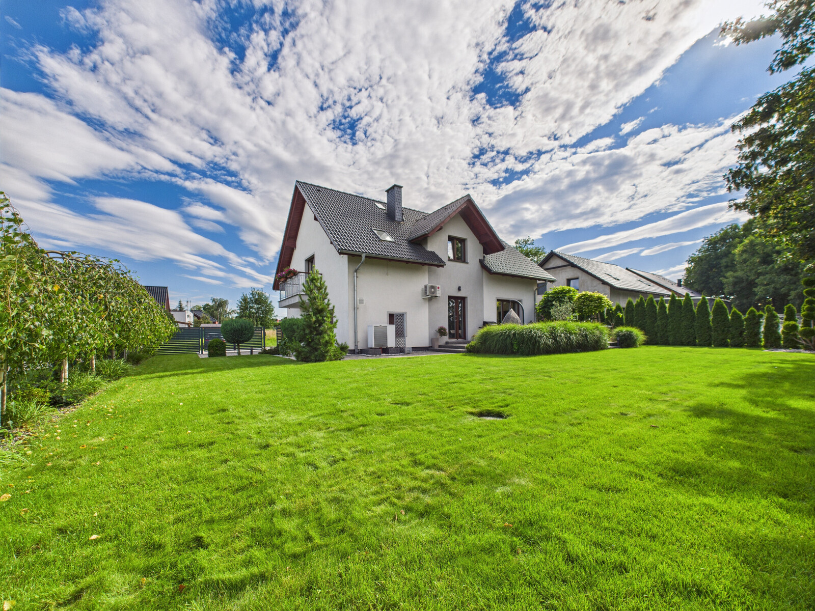 Piękny, zadbany ogród – aranżowany i pielęgnowany przez ogrodnika, bujna roślinność, trawnik w idealnym stanie.