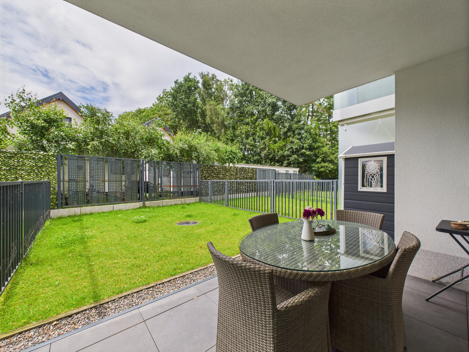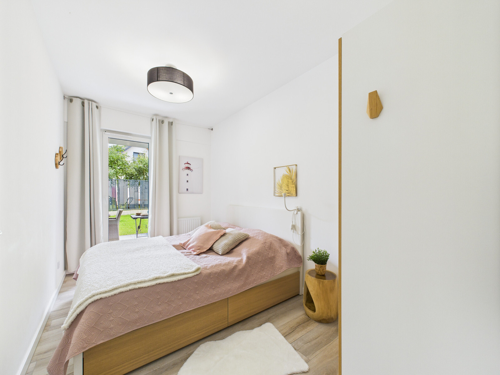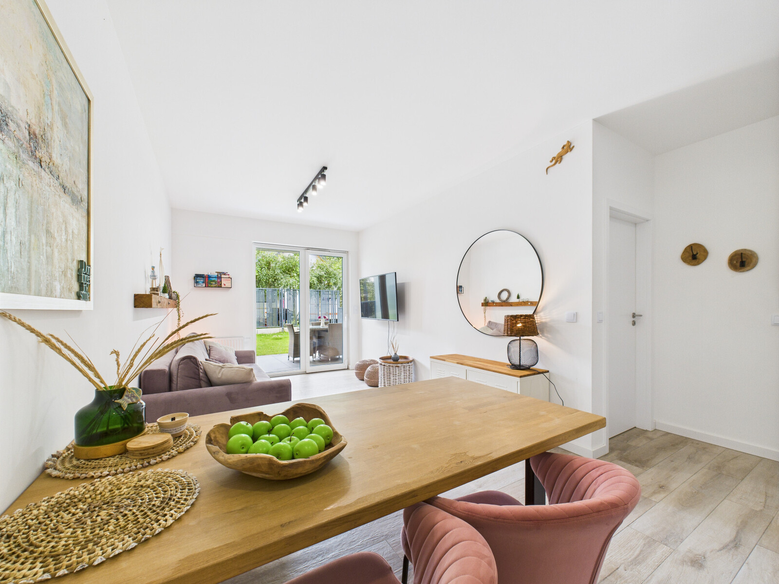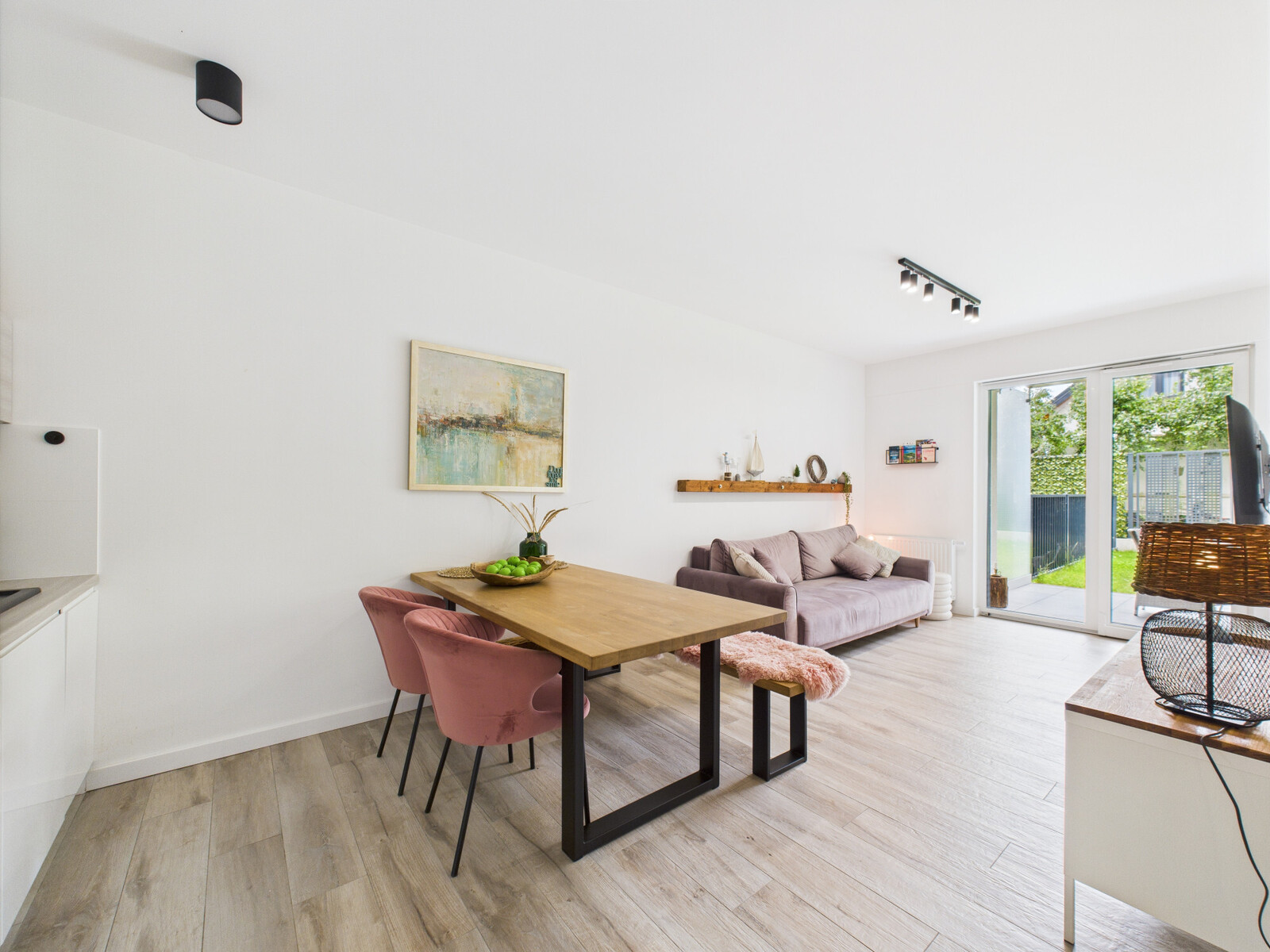 Układ: salon z aneksem kuchennym, sypialnia, łazienka, duży ogród