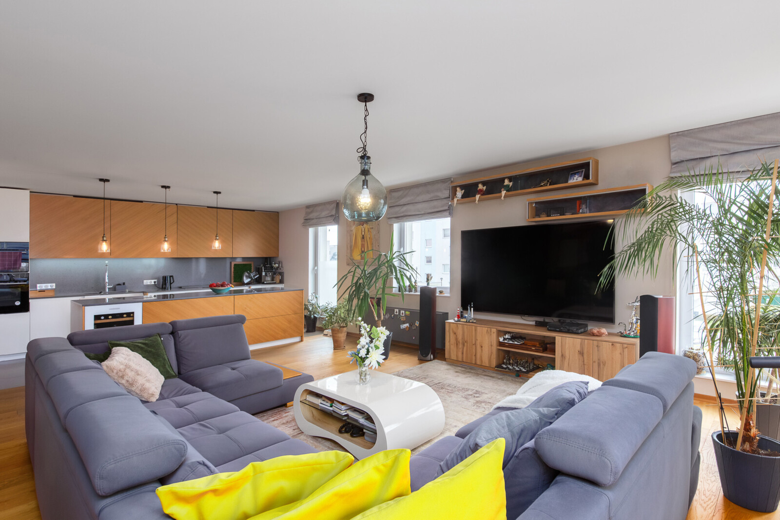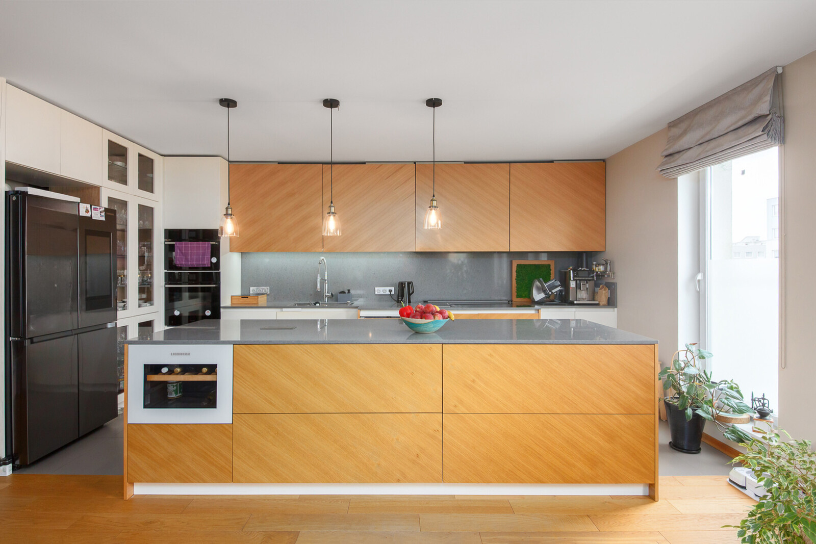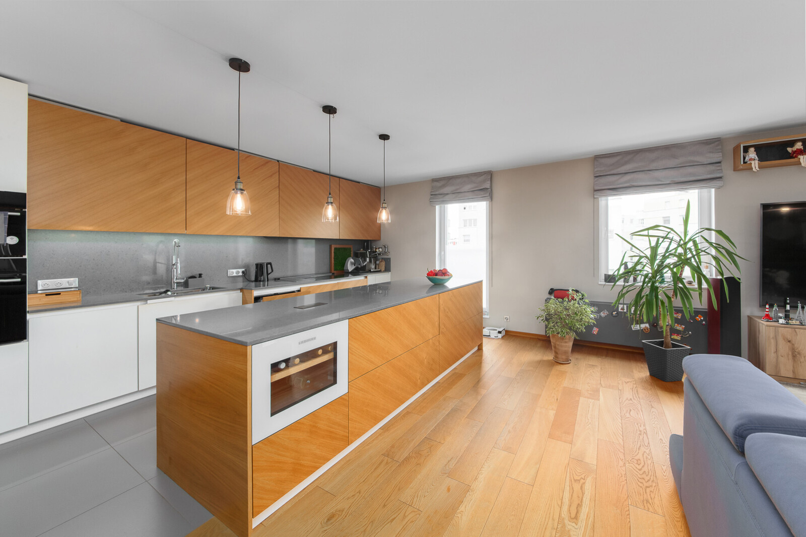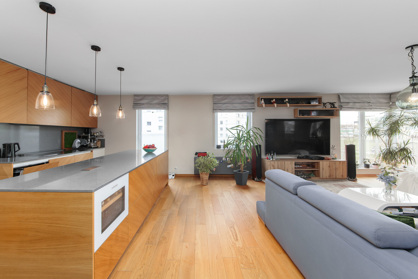 – Salon z otwartą kuchnią – imponująca przestrzeń dzienna z dużymi przeszkleniami, zapewniająca mnóstwo naturalnego światła; nowoczesna kuchnia z granitowymi blatami i meblami wykonanymi na wymiar,